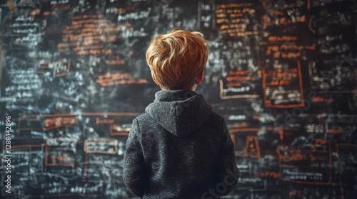 A pupil is listening carefully in class, and the blackboard is full of knowledge points, Overhead view, vignetting