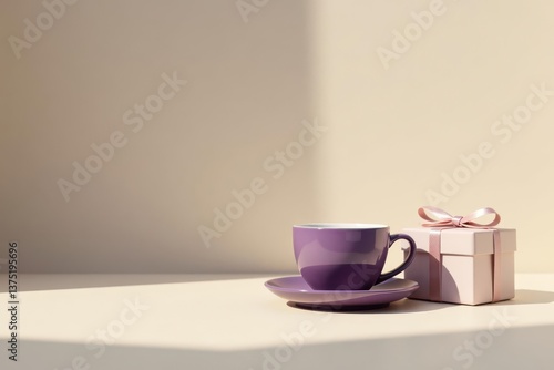 A Purple Teacup and a Delicate Pink Gift Box Resting on a Pale Surface in Soft Sunlight