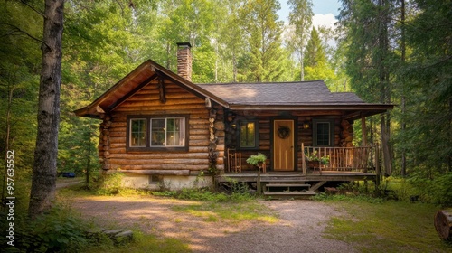 A quaint cabin in the woods with a log exterior, surrounded by tall trees and a serene natural setting.