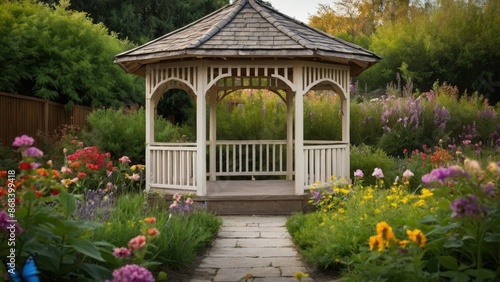A quaint gazebo in the middle of a blooming garden with sunlight and serene atmosphere