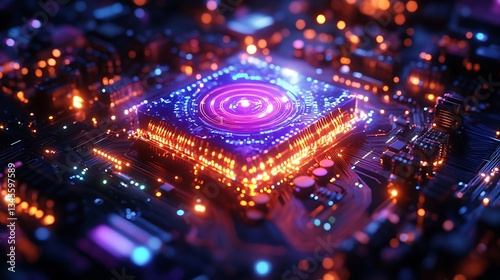 processor, quantum, aglow, center, grid, energy, radiant, glowing, circuit, vibrant, neon, light, blue, purple, emitting, pathway, particle, dynamic, texture, holographic, cinematic, futuristic, glow, intricate