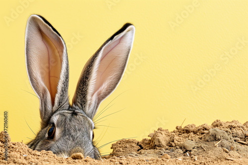 A rabbit with large ears peeps from a hole against a yellow background. Easter / spring theme with copy space for text
