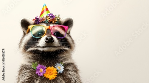 A raccoon wearing a party hat, colorful sunglasses, and a flower necklace, looking up, in front of a light background, balanced composition with ample copy space for text
