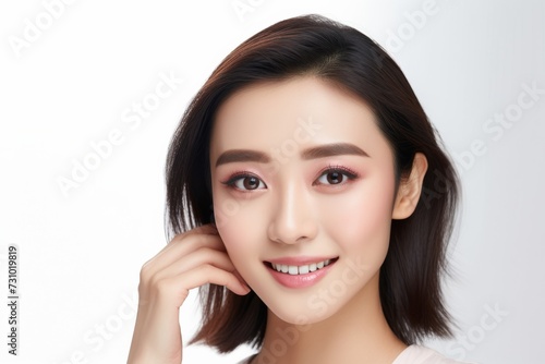 a radiant and cheerful Asian lady dons a white tee t-shirt, beaming with happiness while proudly displaying her smile against a plain white backdrop. Generative AI.