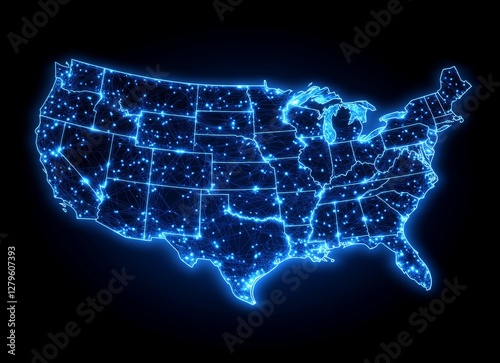 A radiant digital map of the United States, featuring states outlined in vivid blue and orange, materializes from a field of data streams, representing technological innovation and national unity