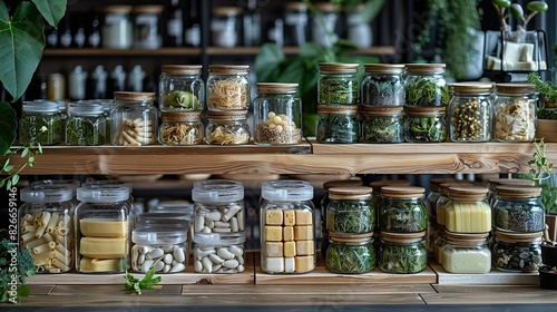 A range of eco-friendly packaging options, such as biodegradable paper boxes and reusable glass jars. These items emphasize sustainable materials and designs.