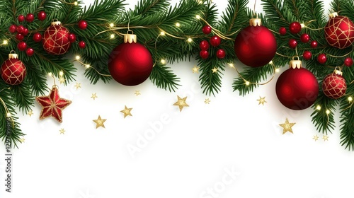 A realistic border with green fir branches, bright red balls, berries, golden twinkling lights, and stars isolated on a transparent background