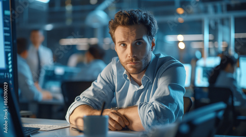 A realistic image of an IT specialist sitting at a desk