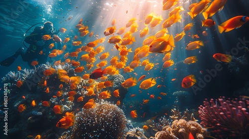 A realistic photo of a scuba diver swimming alongside a school of colorful fish in a coral reef, with bright corals and crystal-clear water creating a breathtaking underwater scene.