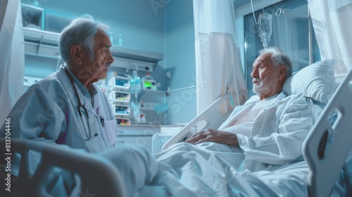 A recovering elderly patient talks to a friendly doctor in the hospital geriatrics unit.