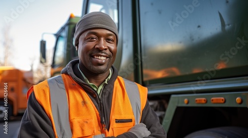 A recycling worker stands smiling and looks at the camera next to a garbage truck. Transporting garbage and garbage