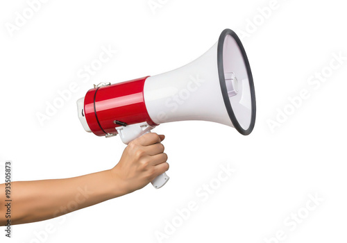 megaphone, speaker, hand, red, white, communication, audio, voice, announcement, isolated, object, device, studio, shot, grip, plastic, handle, equipment, sound, public, address, broadcast, promotion, marketing, event, alert, warning, attention, portable, modern, technology, tool, accessible, design