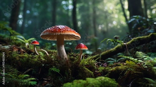 A red and white mushroom with white spots sits in a misty forest with green ferns.