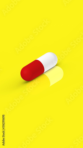 a red capsule lies on a yellow background with reflection. medication. Vertical image. 3D rendering. 3D image