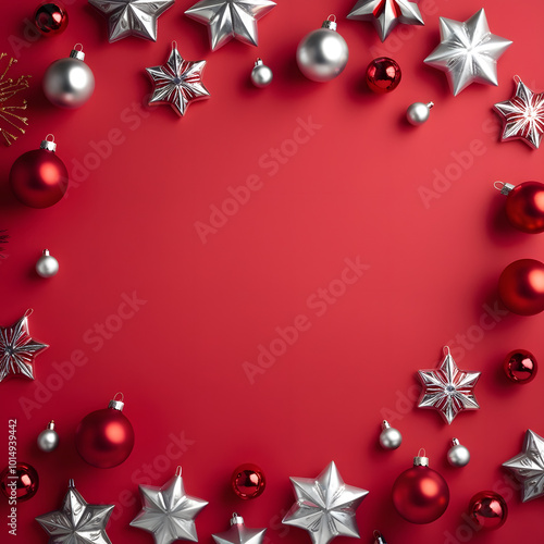 A red Christmas background with snowflake and red and silver ornaments, with room for text