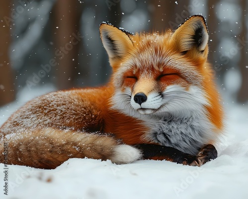 red, fox, snow, winter, forest, landscape, wildlife, nature, fur, cosy, resting, curled, fluffy, cute, sleepy, peaceful, tranquil, serene, cold, weather, tree, tree branch, environment, habitat, mammal, predator, carnivore, canino, animal, portrait, eye, nose, paw, tail, ear, whisker, texture, detail, camouflage, glacé, stillness, patience, survival, wilderness, scenery, beauty, natural