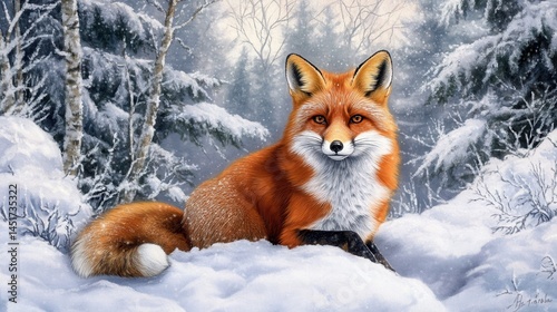A red fox is illustrated amidst a snowy forest, featuring its striking red fur against the pristine white snow and tall, frosted trees.