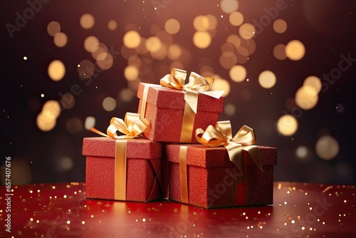 a red gift box with a gold ribbon and a bow. christmas gift boxes in red with gold ribbons