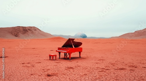 A red grand piano and matching bench placed in a barren, alien desert landscape with mountains in the background and an Earth-like planet on the horizon.