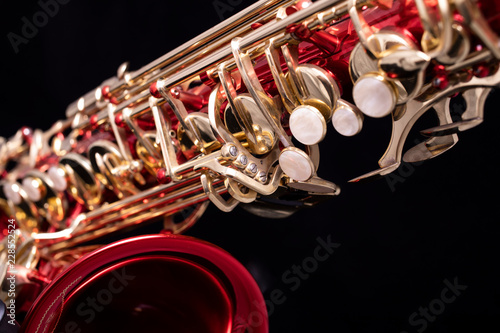 saxophone, wind, instrument, metal, red, lacquered, gold, key, pearl, buttons, black, background, design, isolated, jazz, improvise
