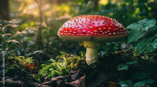 A red mushroom illuminated by dappled sunlight in the middle of a dense