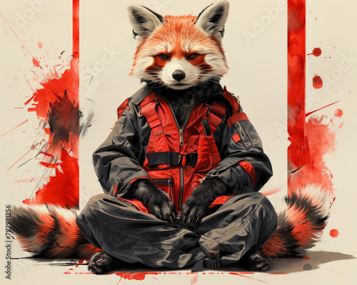 A red panda wearing a red and black jumpsuit is sitting in a meditative pose. The background is white with red paint splatters.
