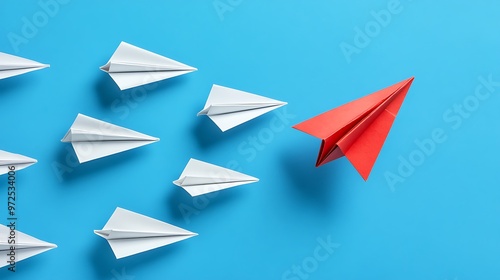 A red paper airplane leading a group of white paper airplanes on a blue background.