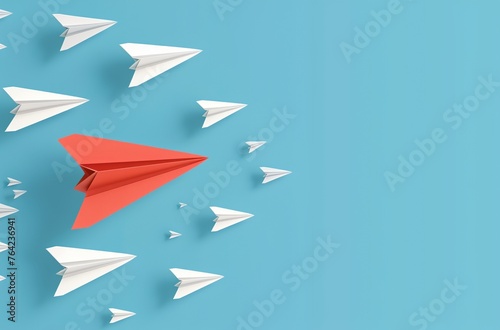 a red paper airplane surrounded by white paper airplanes on a blue background
