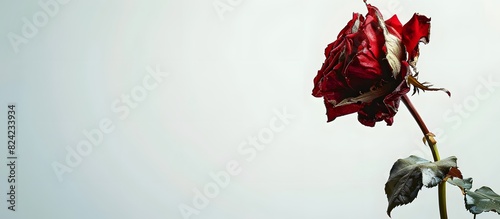 A red rose with stem and leaf on light grey background. Dry, copy space.
