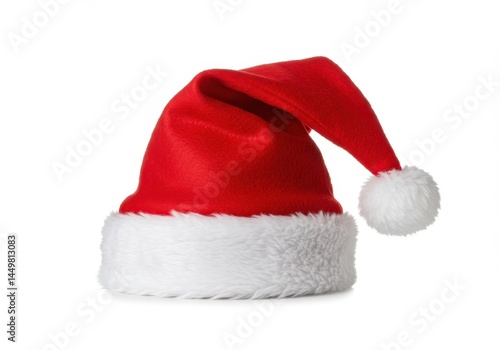 A red santa hat with white trim and a pompom sits on a white background, ready for the holiday season