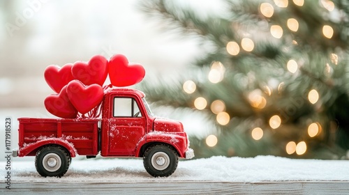 A red toy truck carrying heart-shaped balloons on a snowy table, fir branches in the background with soft, blurred holiday lights