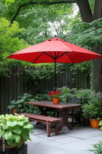A red umbrella is shading a patio table and bench. The table is surrounded by potted plants and flowers
