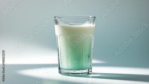 A refreshing coconut juice with water droplets stands alone on a white background.