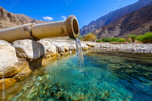 A refreshing drink of water at an oasis, with the crystal-clear spring bubbling up from the earth, offering life to the desert