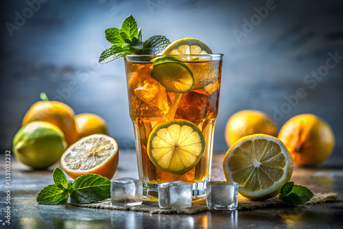 A refreshing glass of golden iced tea with ice cubes and a lemon slice captured in high-detail close-up photography