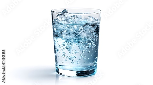 A refreshing glass of ice water with bubbles sits on a white background perfect for health and wellness advertisements.