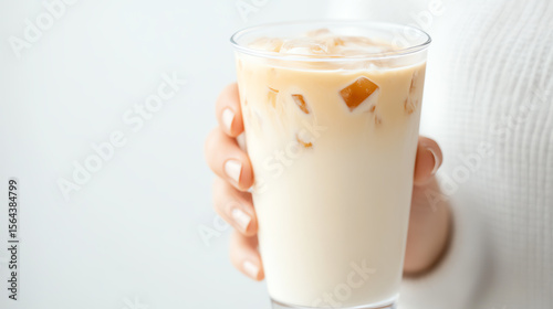 A refreshing glass of iced coffee with cream, garnished with ice cubes, perfect for a warm day, held by a hand.