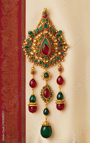 A regal illustration of traditional South Indian temple earrings, adorned with glowing ruby and emerald stones, intricate carvings of deities, and golden embellishments, displayed on a silk cloth with