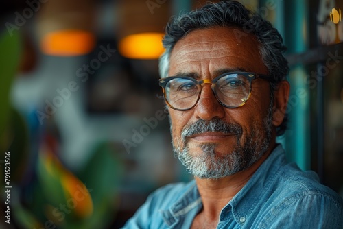 A relaxed middle-aged man wearing denim shirt lost in thoughts while sitting in a cozy ambiance with soft background lighting