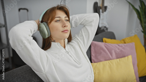 A relaxed young woman enjoys music with headphones in a cozy living room interior.