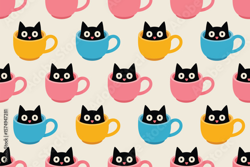 A repeating pattern of black cats sitting inside colorful tea cups on a light beige background design art