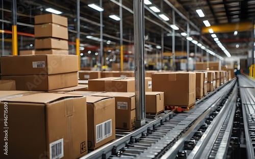 A retail warehouse filled with shelves of cartons, pallets, and forklifts in motion. The blurred background highlights the busy logistics and transportation activities typical of a product distributio