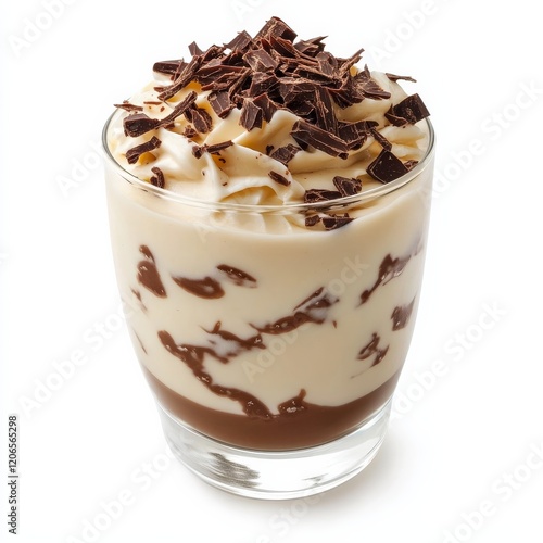 A rich and creamy mudslide with chocolate shavings on top, decadent and smooth, isolated white background