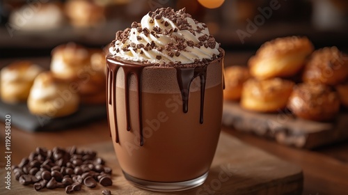 A Rich Hot Chocolate With a Chocolate Drizzle and Whipped Cream, Served in a Charming Bakery Cafe With Pastries in the Background, Beverage Photography, Drinks Menu Style Photo Image