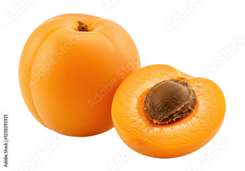 A ripe apricot and a halved apricot with a visible pit, isolated on white background, no depth of field, sharp.