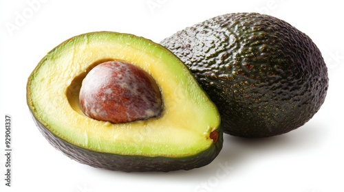 A ripe avocado, halved to reveal the creamy green flesh and seed, isolated on a white background