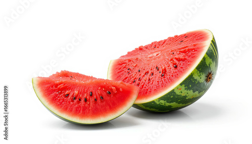 A ripe watermelon is cut in half, revealing its vibrant red interior filled with seeds. A slice is placed next to the half, emphasizing its juicy texture. This display highlights the refreshing fruit