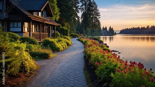 A road leading to a picturesque lakeside lodge