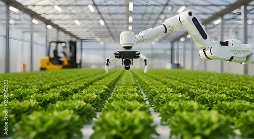 A robotic arm and a smaller rover tend to rows of lush green plants inside a modern, automated greenhouse, showcasing the future of agriculture and technology working in harmony