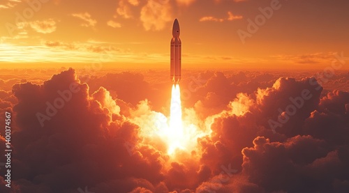 rocket, launch, orange, sky, dusk, cloud, flames, smoke, ascent, space, technology, exploration, evening, horizon, aerospace, dramatic, event, travel, propulsion, atmosphere, mission, adventure, excitement, innovation, engineering, power, visual, spectacle, altitude, journey, dream, future, discovery, speed, soaring, emission, thrill, dynamic, aerial